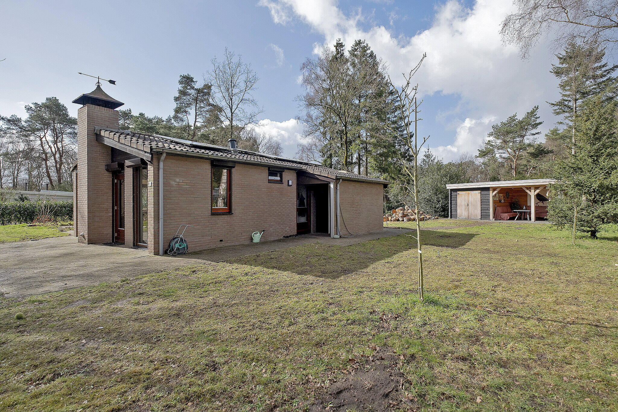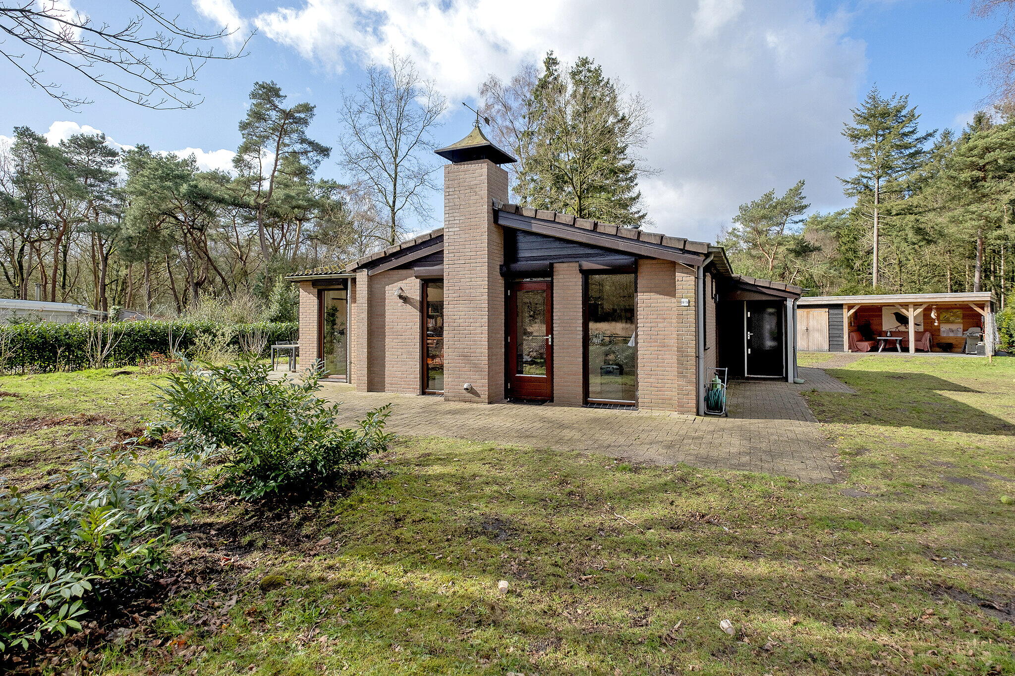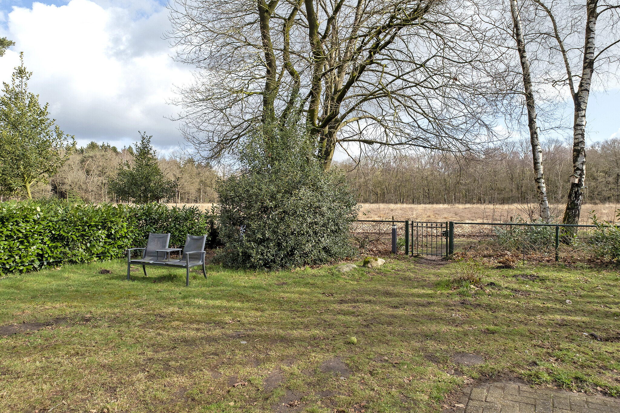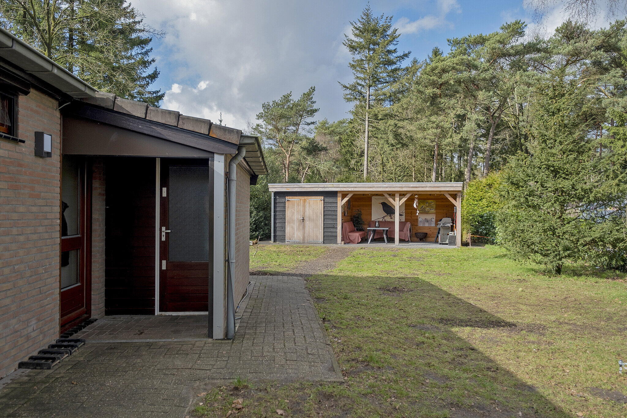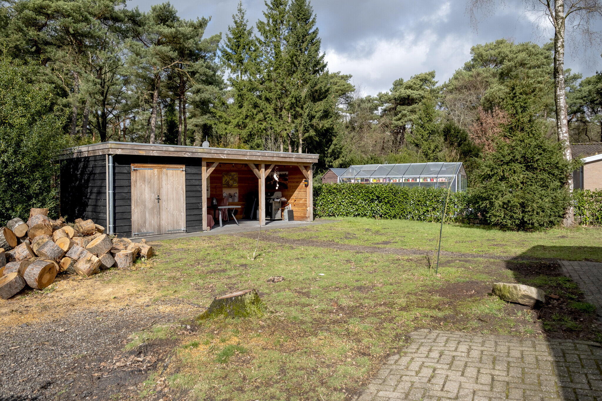 Het wilde landschap van de prachtige heidevelden loopt soepel over in het gazon rondom de bungalow. Er is in de afgelopen jaren een houten berging met overkapping gerealiseerd, waar heerlijk genoten kan worden van het prachtige uitzicht. Verder is er een aangebouwde, stenen berging voor het opbergen van o.a. tuingereedschap. In deze berging bevindt zich de witgoedaansluiting.