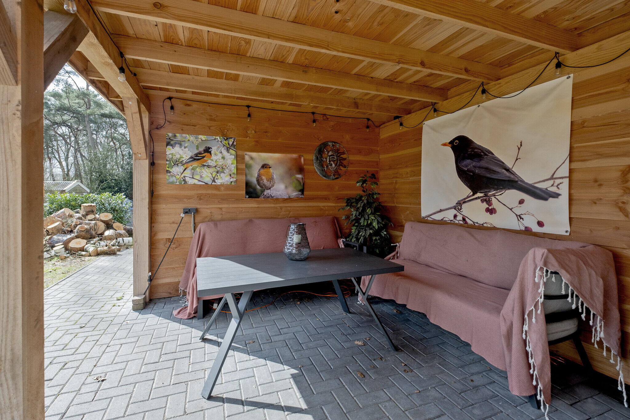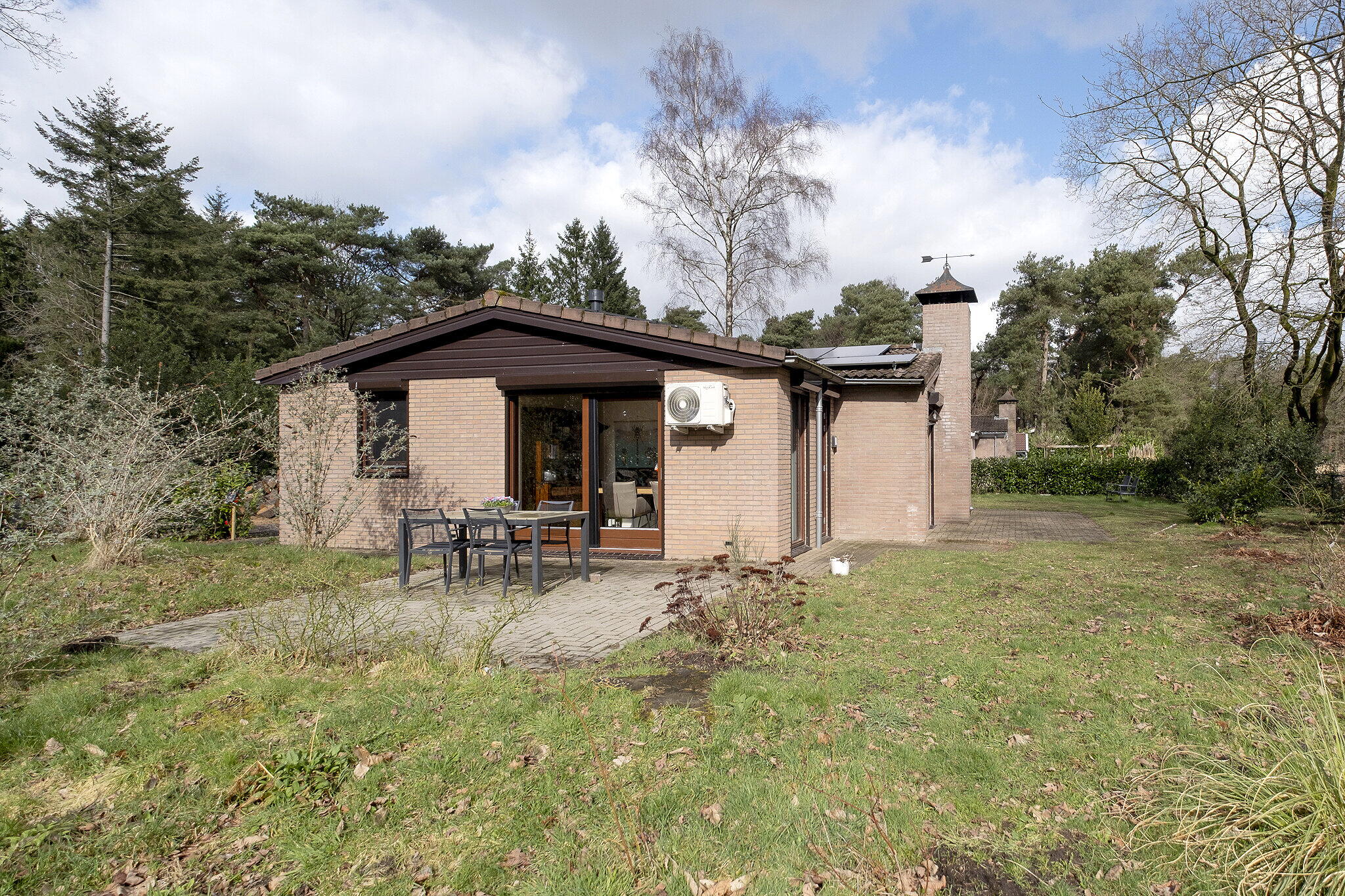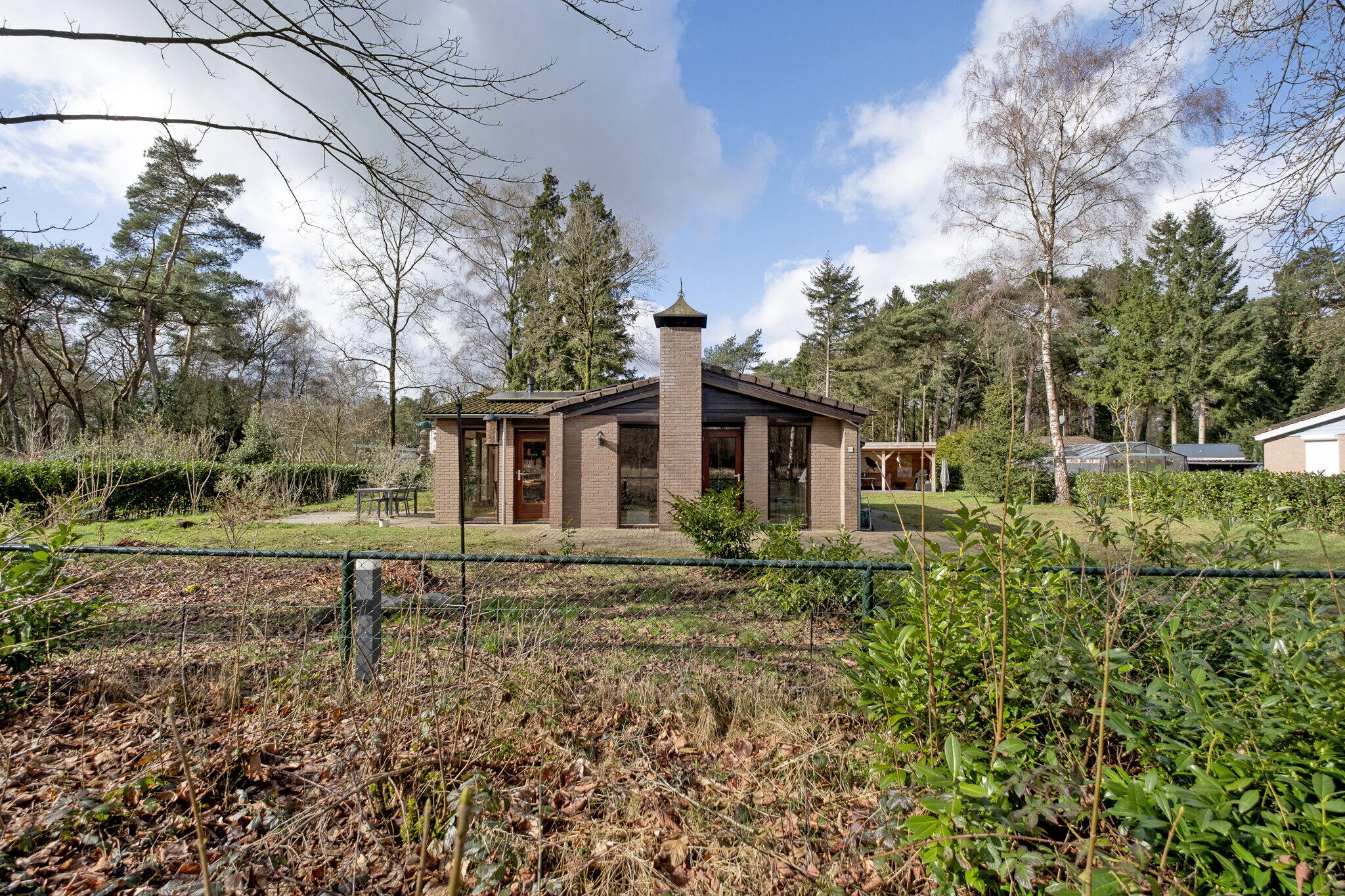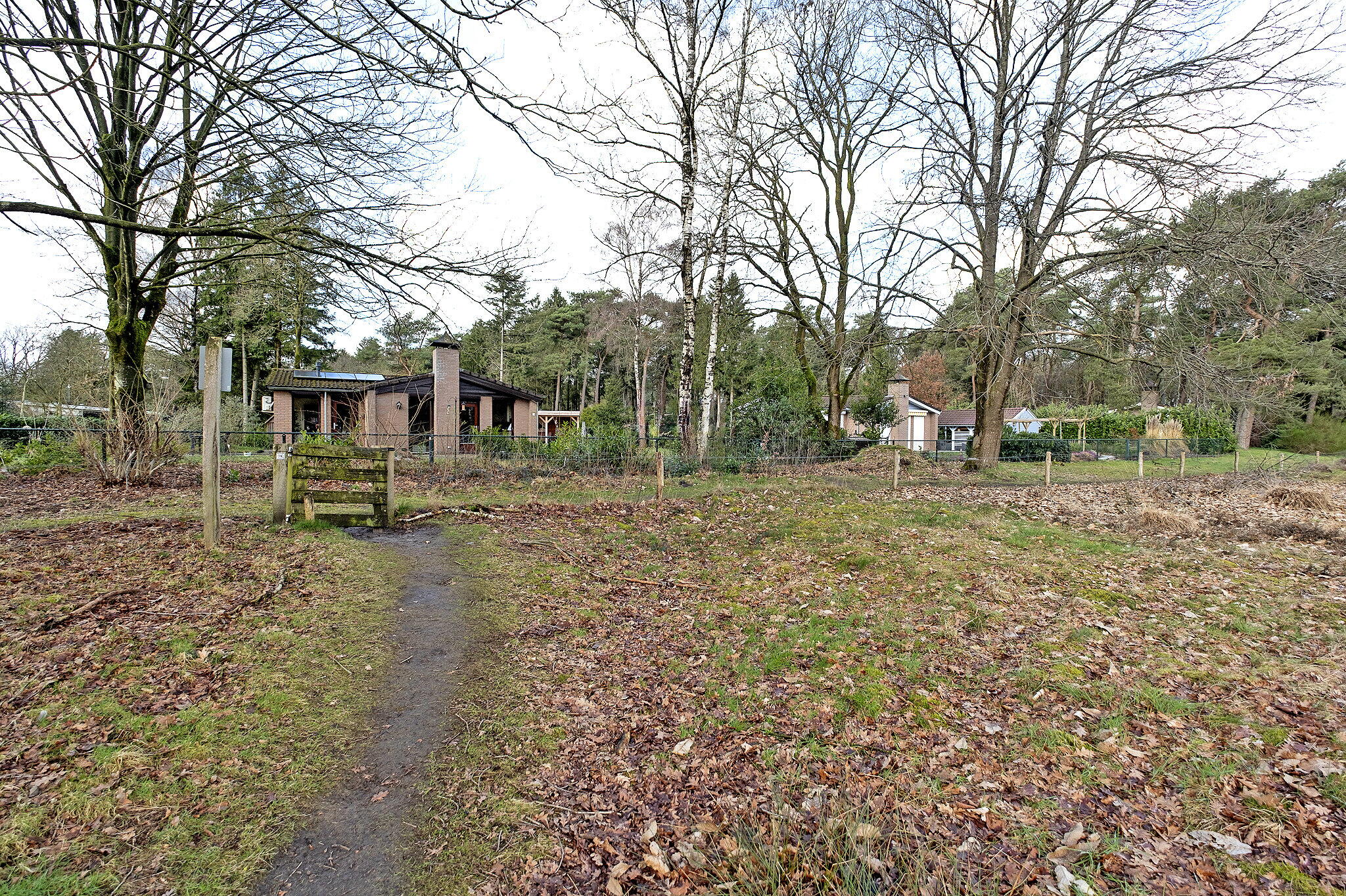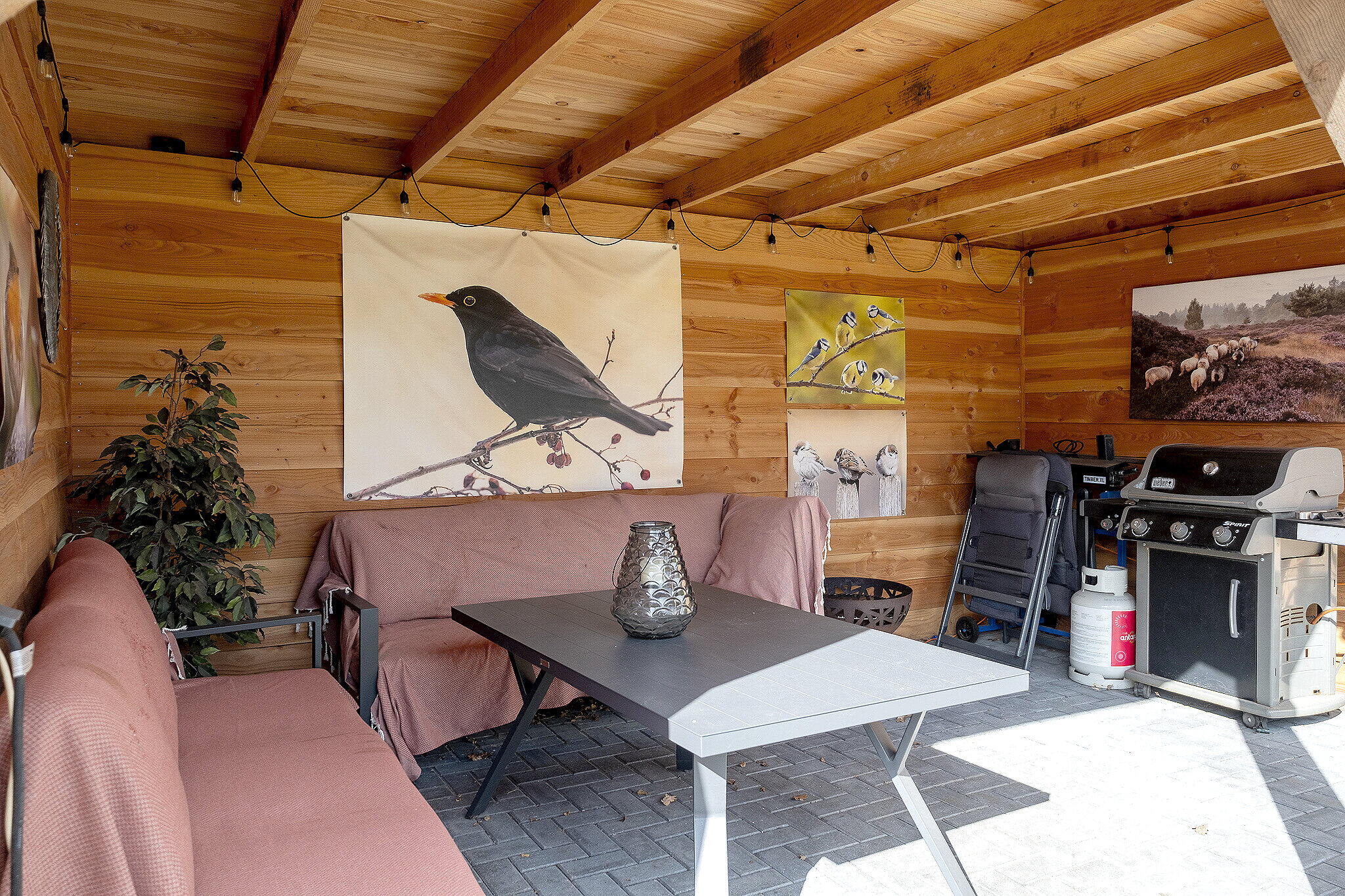 Het wilde landschap van de prachtige heidevelden loopt soepel over in het gazon rondom de bungalow. Er is in de afgelopen jaren een houten berging met overkapping gerealiseerd, waar heerlijk genoten kan worden van het prachtige uitzicht. Verder is er een aangebouwde, stenen berging voor het opbergen van o.a. tuingereedschap. In deze berging bevindt zich de witgoedaansluiting.