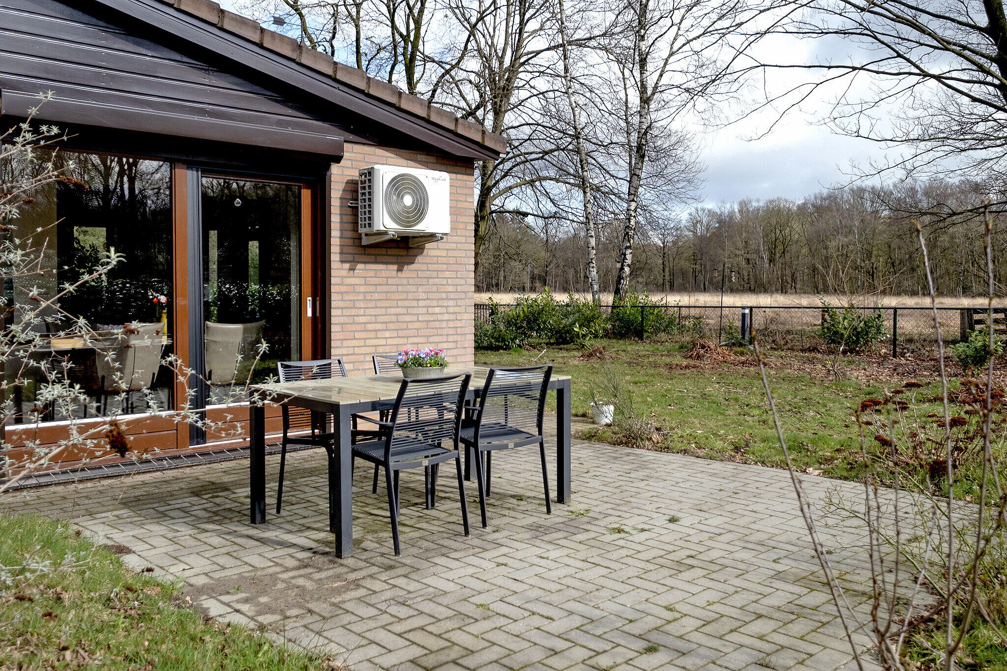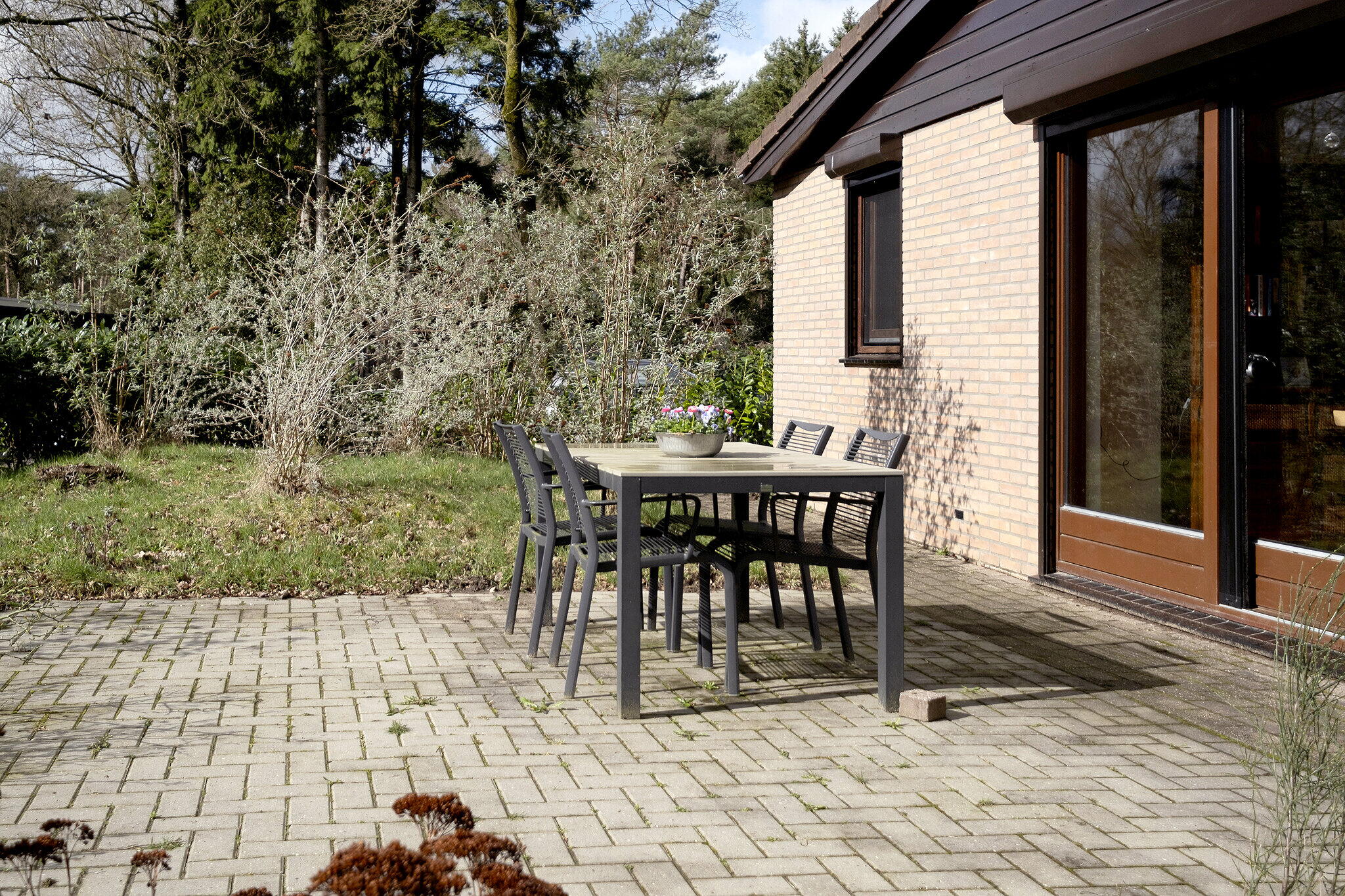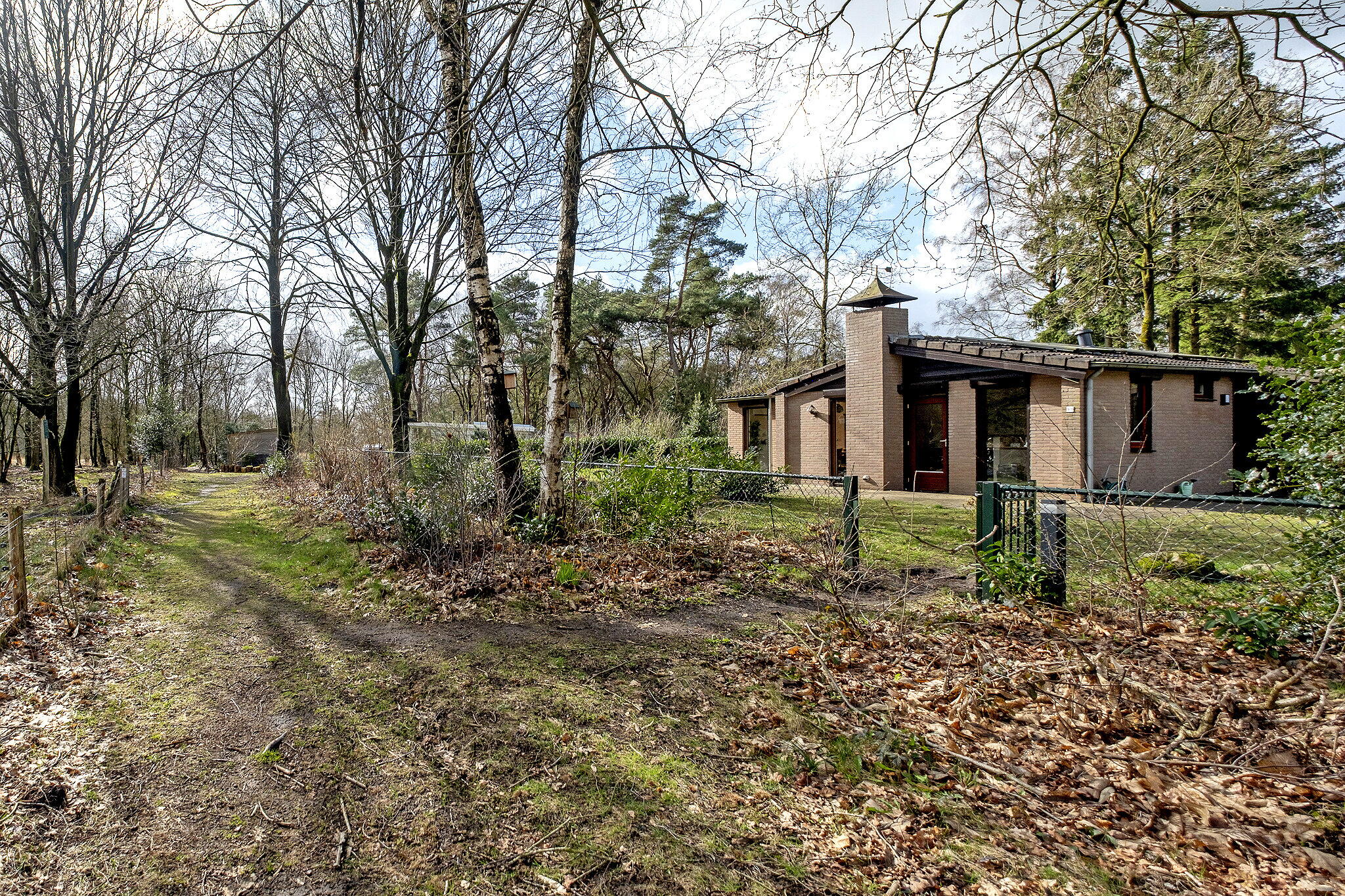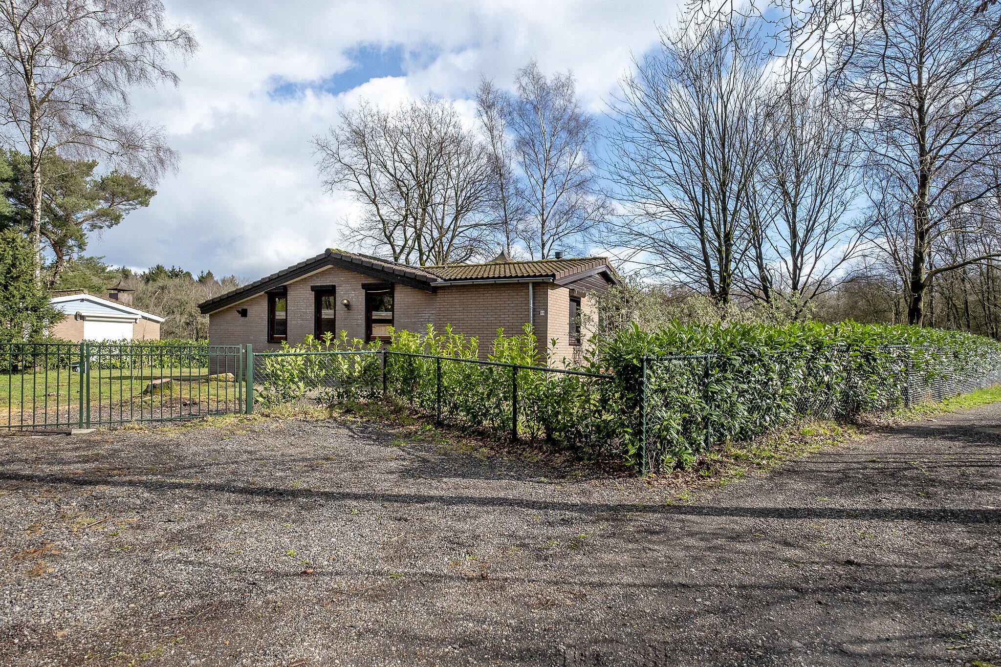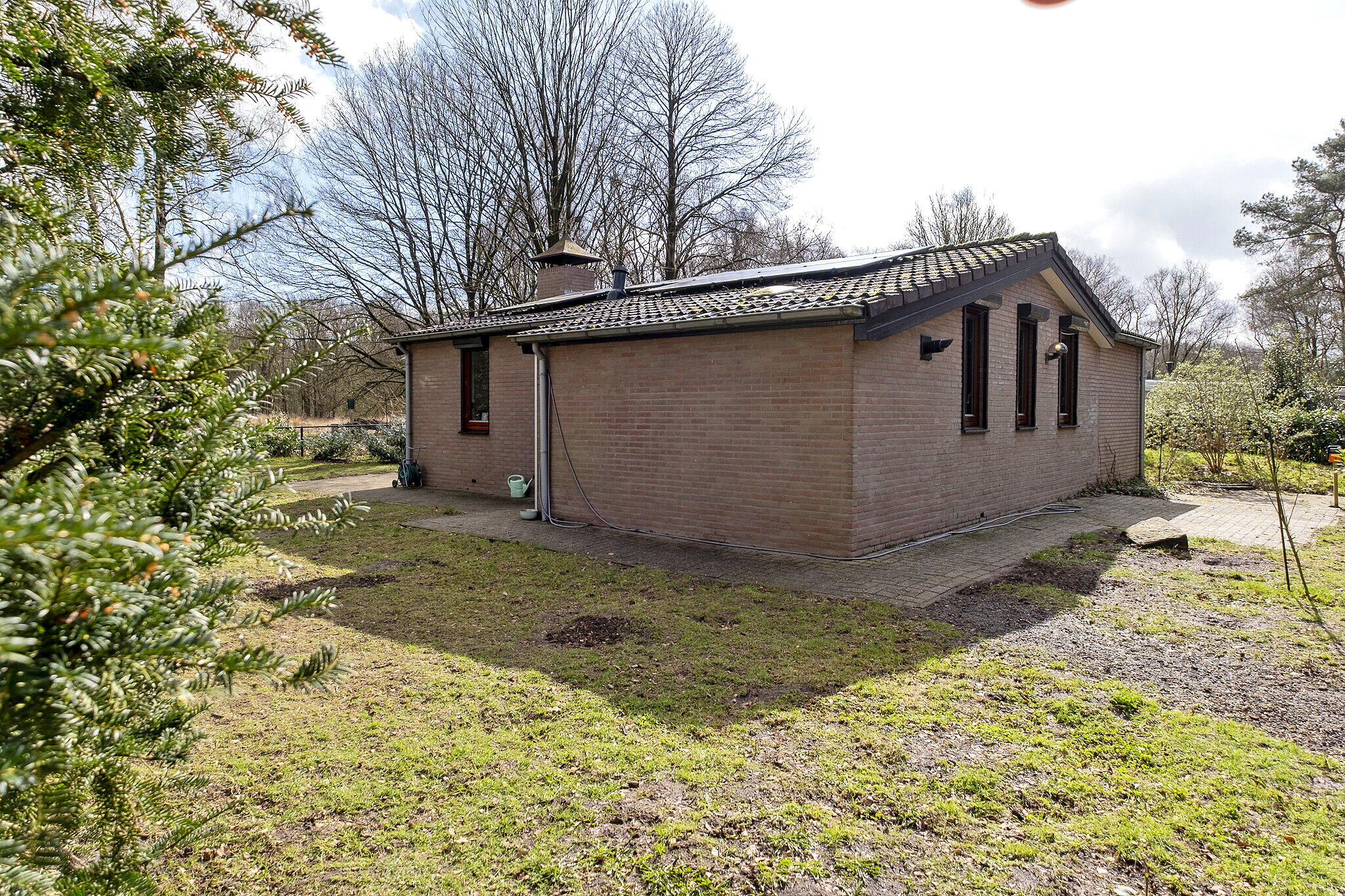 Het wilde landschap van de prachtige heidevelden loopt soepel over in het gazon rondom de bungalow. Er is in de afgelopen jaren een houten berging met overkapping gerealiseerd, waar heerlijk genoten kan worden van het prachtige uitzicht. Verder is er een aangebouwde, stenen berging voor het opbergen van o.a. tuingereedschap. In deze berging bevindt zich de witgoedaansluiting.