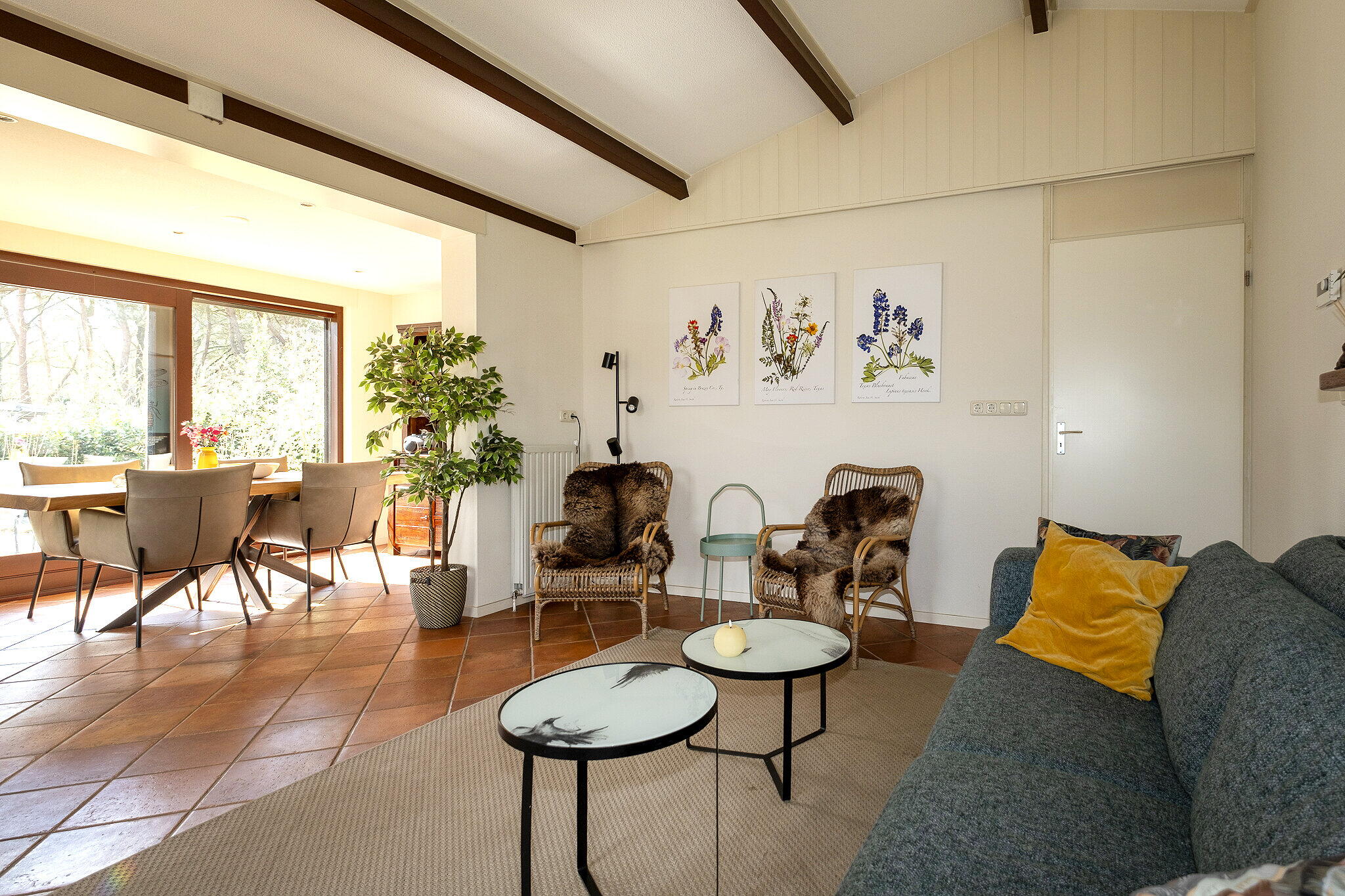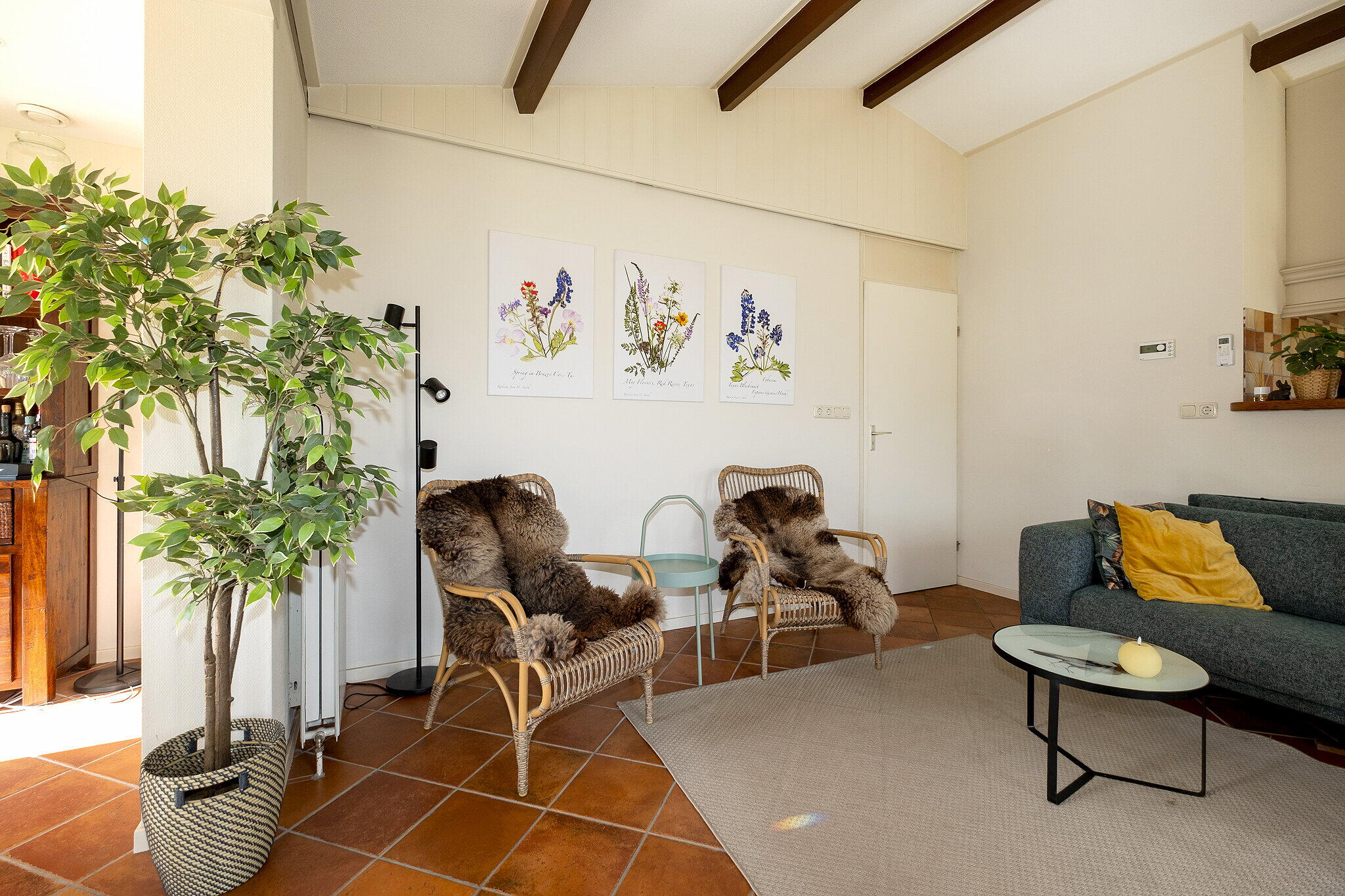 Entree in hal die een centrale functie heeft in de woning. De riante woonkamer met open keuken (samen ca. 36 m2) heeft een stijlvolle open kapconstructie en volop lichtinval. De moderne keuken is voorzien van inbouwapparatuur, waaronder o.a. een kookplaat, koelkast, vaatwasser en combi oven-magnetron. De gehele woning is voorzien van een plavuizenvloer, de schuifpui biedt toegang tot het terras aan de zijkant van de woning. Verder beschikt de bungalow over twee slaapkamers (ca. 15 m2 en ca. 5 m2) en een badkamer en-suite (ca. 8 m2). De grootste slaapkamer is voorzien van een kurk vloer. De badkamer is uitgevoerd met toilet, douche en een dubbel wastafelmeubel. De muren van de woning zijn in 2024 geïmpregneerd om vocht tegen te houden.